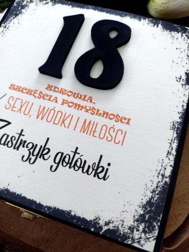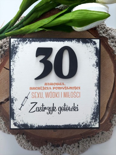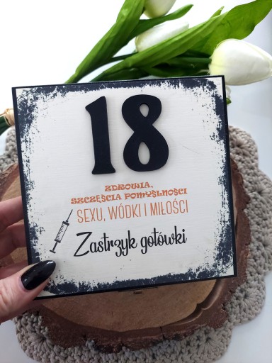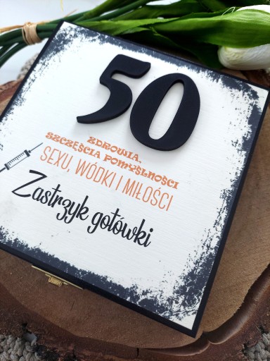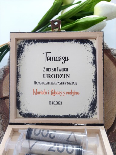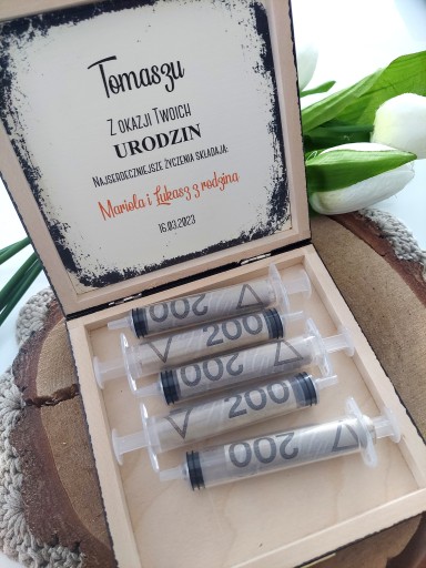 Drewniane sosnowe pudełko w kolorze czarnym z 5 strzykawkami do których zwijamy i wkładamy określoną kwotę. Na przodzie nadruk i drewniana duża cyfra. Wewnątrz są umieszczone życzenia.
