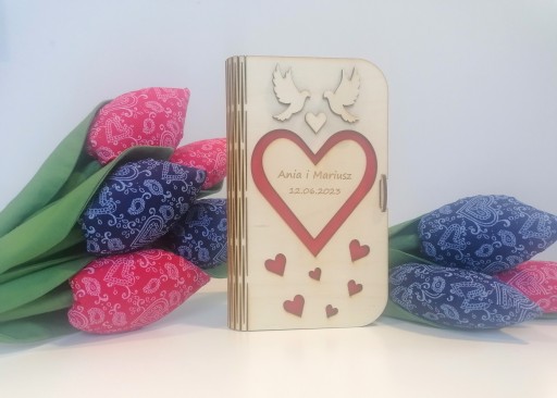 Na przodzie graweruję imiona młodych oraz datę a w środku znajduje się wkładka z Twoimi życzeniami.