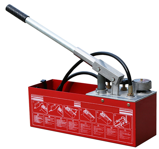 Po podłączeniu pompy, napełnieniu pompy i testowanej instalacji wodą, odkręceniu zaworu VI i zakręceniu zaworu V2 pompuje się wodę za pomocą dźwigni obserwując wskazówkę manometru. Po uzyskaniu żądanego ciśnienia należy zakręcić zawór VI . Jeżeli ciśnienie testowe zostanie przypadkowo przekroczone po zakręceniu zaworu VI odkręca się delikatnie zawór V2.Ciśnienie wówczas zacznie opadać