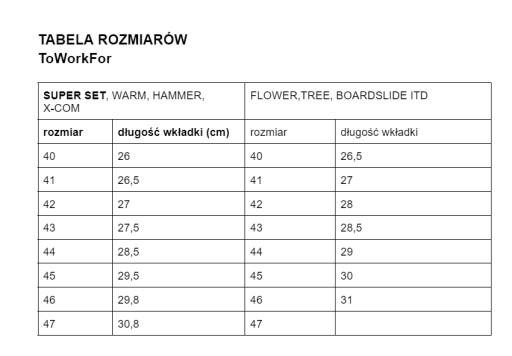 PONIŻEJ ZNAJDUJE SIĘ TABELA ROZMIARÓW MODELU SUPER SET TOWORKFOR® ⬇️