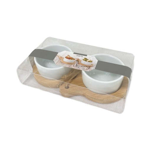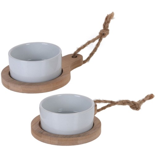 Zestaw do serwowania przekąsek i tapas (2 szt.) wykonane są z ceramiki i drewnianych podstawek z rączką ułatwiającą przenoszenie.