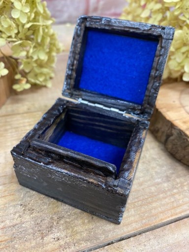 Ręcznie wykonane drewniane pudełeczko na pierścionek. Drewno jest wypalane prądem, który tworzy wyjątkowe wzory. Pudełko barwione bejcą wodną a następnie lakierowane. Dodatkowo posiada środek wyłożony niebieskim filcem.