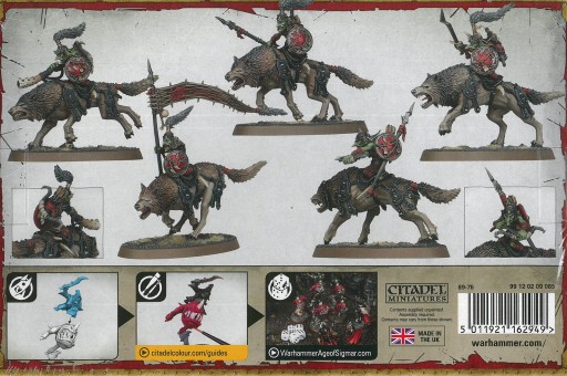 Zestaw figurkowy do złożenia, sklejenia i pomalowania. Skala: 28 mm. Modele przedstawiają goblińską kawalerię na wilkach.