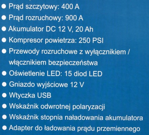 - Urządzenie zostało wyposażone w możliwość rozruchu akumulatorów prądem szczytowym na poziomie 900A. Wbudowane mocne przewody rozruchowe w sposób szybki pozwalają na obsługę akumulatorów.