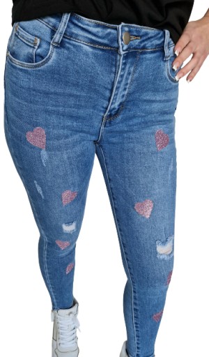 Bestsellerowy model spodni jeansowych o dopasowanym kroju, z wyjątkowym printem w serduszka, od polskiego producenta Minouu. Spodnie idealnie sprawdzą się w codziennych stylizacjach zapewniając Ci wygodę oraz modny look.