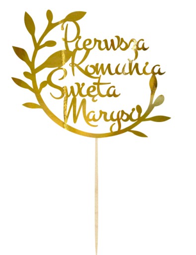 Topper, napis na Komunię Świętą w kolorze złotym z imieniem dziecka i ozdobnymi gałązkami. Produkt personalizowany, podkreśli wyjątkowy charakter uroczystości i będzie doskonałym akcentem na torcie lub w bukiecie. Dekoracyjny pik wykonany z lustrzanego złota pięknie mieni się w świetle i odbija przedmioty jak "lustro". Topper wykonujemy na indywidualne zamówienie klienta.