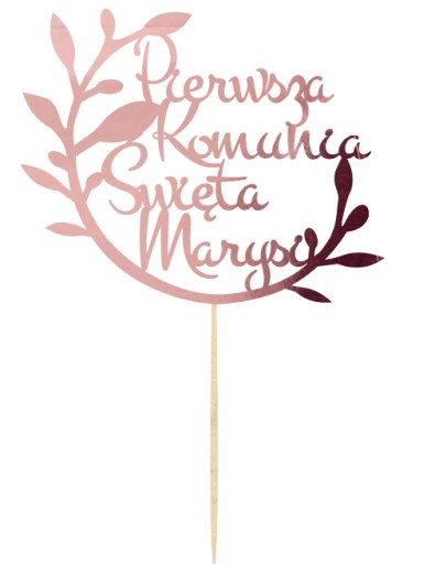 Topper, napis na Komunię Świętą w kolorze różowego złota z imieniem dziecka i ozdobnymi gałązkami. Produkt personalizowany, podkreśli wyjątkowy charakter uroczystości i będzie doskonałym akcentem na torcie lub w bukiecie. Dekoracyjny pik wykonany z lustrzanego różowego złota pięknie mieni się w świetle i odbija przedmioty jak "lustro". Topper wykonujemy na indywidualne zamówienie klienta.