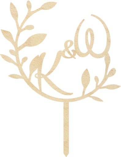Topper, napis na Ślub z inicjałami Młodej Pary i ozdobnymi gałązkami. Produkt personalizowany, podkreśli wyjątkowy charakter uroczystości i będzie doskonałym akcentem na torcie lub w bukiecie. Dekoracyjny pik wykonany z drewna, cięty laserowo. Topper wykonujemy na indywidualne zamówienie klienta. Inicjały będą dopasowane graficznie tak aby razem tworzyły wspólną całość.