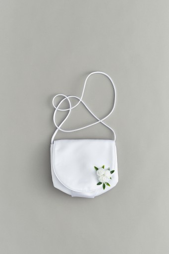 Torebka do komunii wykonana została z matowej satyny ślubnej. Posiada jedną komorę zamykaną na rzep oraz delikatny materiałowy pasek. Całość ozdobiona została bukiecikiem z białej róży piankowej.