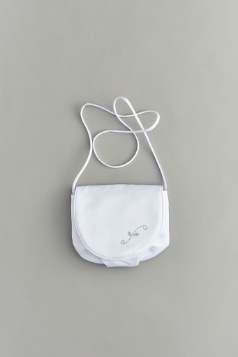 Torebka do komunii wykonana została z matowej satyny ślubnej. Posiada jedną komorę zamykaną na rzep oraz delikatny materiałowy pasek. Całość ozdobiona została aplikacją z cyrkonii układającą się w subtelny wzór.