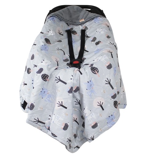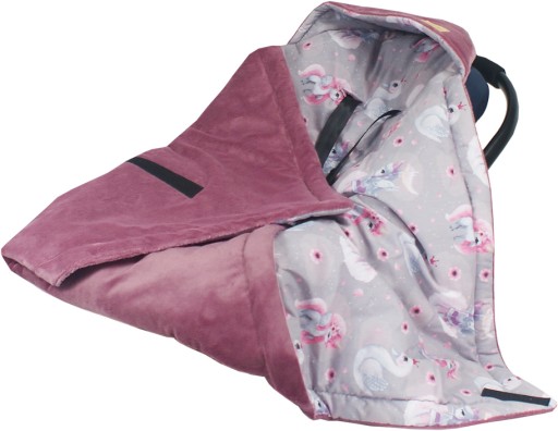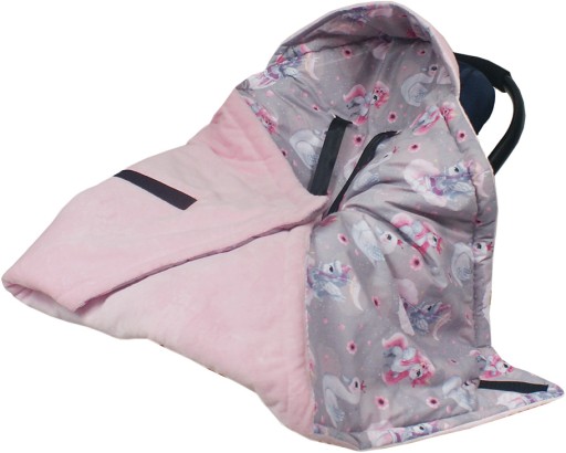 Otulacz/kocyk posiada otwory na pasy bezpieczeństwa 3 lub 5 punktowe (do wyboru). Nie pasuje do fotelika samochodowego z pasami zespolonymi.