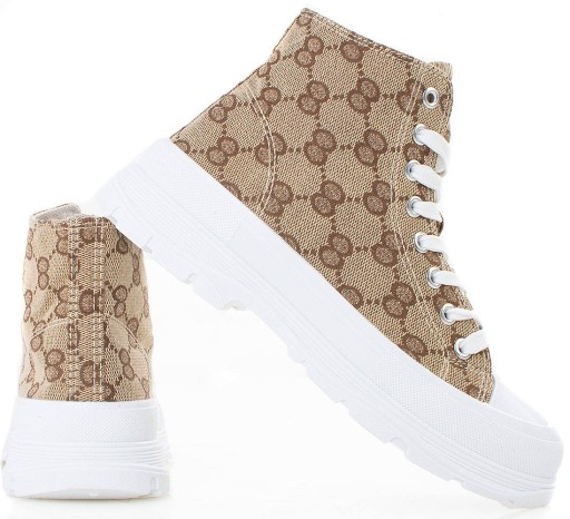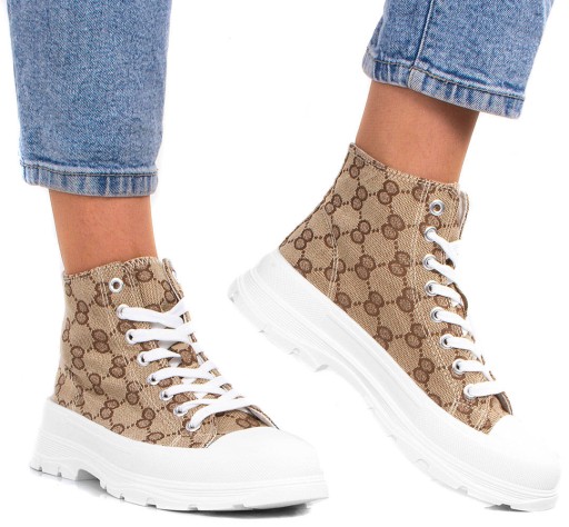 Damskie wysokie buty sportowe a'la trampki. Wykonane z materiału tkaninowego na grubszej, wygodnej podeszwie z platformą. Model ze sznurowaną cholewką, tkaninowa wkładka.