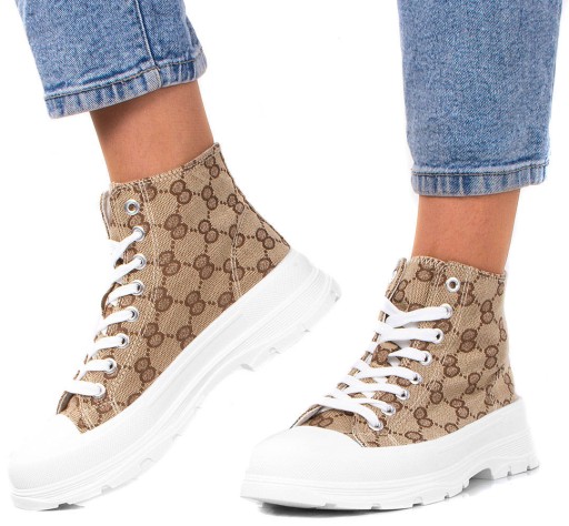 Damskie wysokie buty sportowe a'la trampki. Wykonane z materiału tkaninowego na grubszej, wygodnej podeszwie z platformą. Model ze sznurowaną cholewką, tkaninowa wkładka.