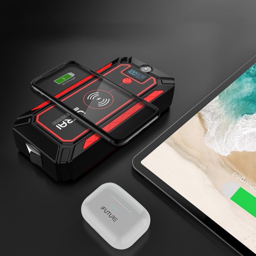 Ten startowy power bank z ładowaniem bezprzewodowym 10 W i 3 portami USB, Ta ładowarka samochodowa jest wyposażona w 2 wyjścia USB (5 V/3 A QC3.0) (9 V/2 A), port typu C (wyjście i wejście) do ładowania 4 urządzeń jednocześnie, takich jak smartfony, iPady i Kindle. Wyjście DC do zasilania akcesoriów samochodowych.