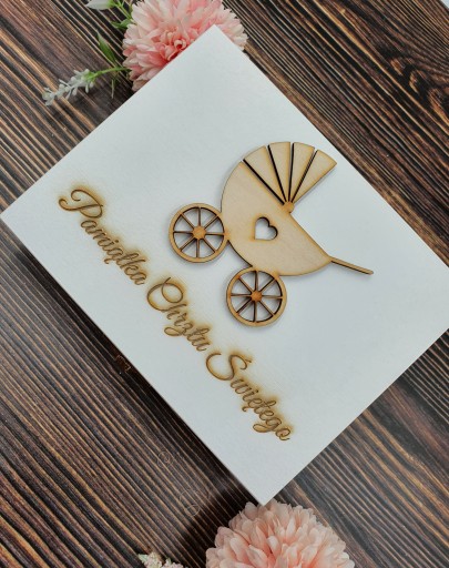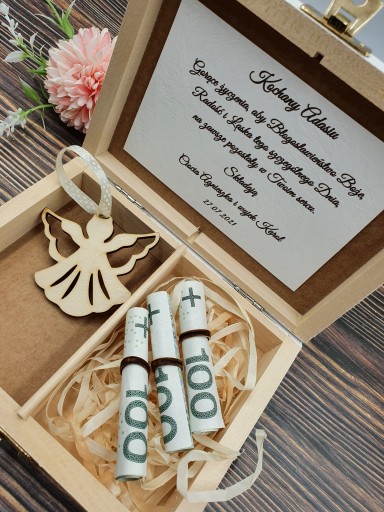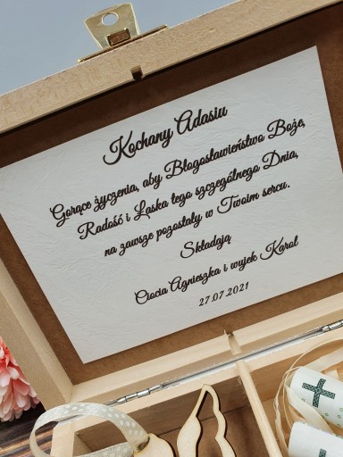 Pudełko zawiera imię dziecka jak i również osób wręczających prezent. Do wyboru maja Państwo również dużą ilość życzeń. Można przesłać własne.