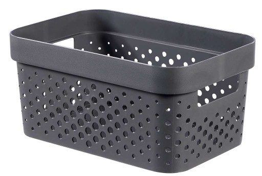 Popularne pojemniki ażurowe Infinity, pasujące do każdego wnętrza. Pojemniki zostały wyposażone w małe otwory na palce po obu stronach, co pomaga w ich przenoszeniu. Występują na innych naszych aukcjach w kilku rozmiarach oraz w kilku, atrakcyjnych kolorach. Chropowata powierzchnia ogranicza przemieszczenie się przedmiotów podczas przenoszenia pojemnika. Dzięki licznym otworom pojemnik można z powodzeniem używać w łazience, bądź kuchni. Pojemnik jest bez pokrywki. Na innych naszych aukcjach można znaleźć te same pojemniki już z pokrywkami.