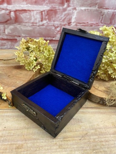 Ręcznie wykonana drewniana szkatułka. Drewno jest wypalane prądem, który tworzy wyjątkowe wzory, następnie barwione bejcą wodną i lakierowane. Dodatkowo szkatułka posiada ozdobne okucia oraz zapięcie. Środek jest wypełniony niebieskim filcem.
