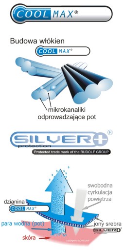 Tkanina COOLMAX® posiada krótki czas schnięcia co zminimalizuje prawdopodobieństwo wychłodzenia organizmu przez wilgotny materiał.