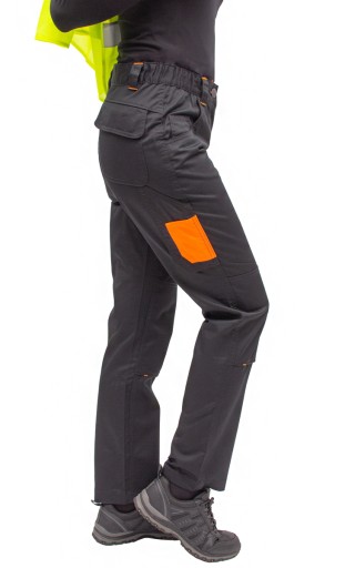 ► Wytrzymałe damskie spodnie robocze do pasa z wysokim stanem.