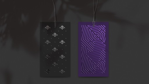 Ekskluzywne etykiety, pokryte obustronnie aksamitną folią soft touch z dodatkowym lakierem UV nakładanym punktowo na wybrane elementy.