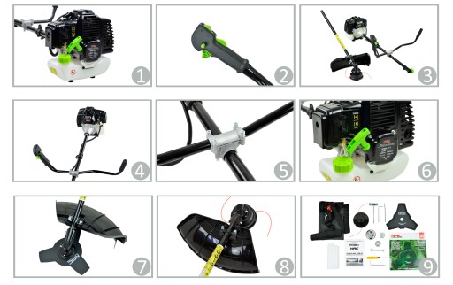 W zestawie znajduje się żyłkowa głowica tnąca posiadająca automatyczny system podawania żyłki oraz dodatkowa trójzębna tarcza tnąca, która w szybki i łatwy sposób pozwala uporać się z chwastami. łodygami, odrostami drzew i krzewów, itp. Szerokość robocza głowicy żyłkowej wynosi 42 cm a tarczy tnącej 25.5 cm.
