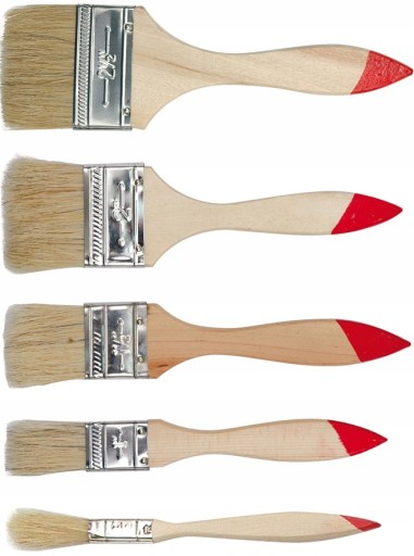 Zestaw pięciu pędzli płaskich typu angielskiego. Szczecina oprawiona w metalowej skuwce, osadzonej na drewnianym lakierowanym trzonku. W zestawie pędzle o szerokościach 13;25;36;50;63 mm