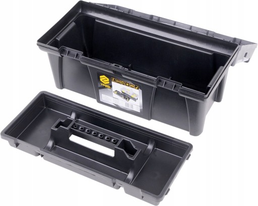 Skrzynka narzędziowa 12" z wyciąganą tacką z uchwytem na bity oraz dodatkowymi organizerami do przechowywania drobnych przedmiotów. Wykonana z tworzywa sztucznego. Solidne zapięcie zapobiega niechcianemu otwarciu w trakcie przenoszenia. Skrzynka posiada specjalnie wyprofilowane boczne uchwyty ułatwiające przenoszenie. Służy do wygodnego transportu różnego rodzaju przedmiotów, np. narzędzi, akcesoriów wędkarskich, itp.