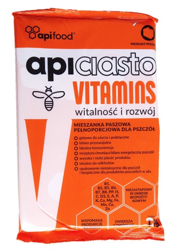 Ciasto dla pszczół APICIASTO VITAMINS świetnie nadaje do podkarmiania w okresie popożytkowym do uzupełniania „żelaznego zapasu”, podsycania. Dzięki zawartości witamin z grupy B stymuluje matki do czerwienia i zwiększa produkcję mleczka. Pokarm zasobny w witaminy zwiększa żywotność i witalność pszczół.