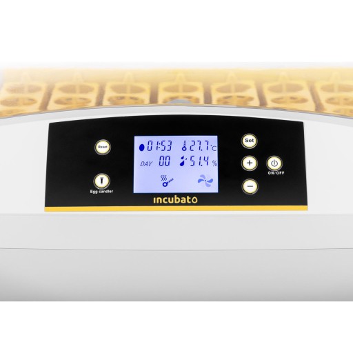 Urządzenie wyposażone zostało w panel sterowania z ekranem LCD, który pozwala kontrolować parametry procesu. Inkubator posiada system rotacji jajek oraz wbudowany owoskop do podglądania zarodków. W urządzeniu zastosowano silnik o mocy 90 W, energooszczędny i bardzo wydajny a także inteligentny system kontroli temperatury w zakresie 30 - 39,5C. Silikonowy przewód grzewczy utrzymuje moc i temperaturę na stabilnym poziomie. Inkubator posiada stopień ochrony IPX4, jest odporny na spryskiwanie i zachlapanie wodą z różnych kierunków. Bezpieczeństwo zapewnia także system ochrony przed porażeniem prądem.
