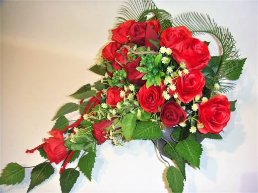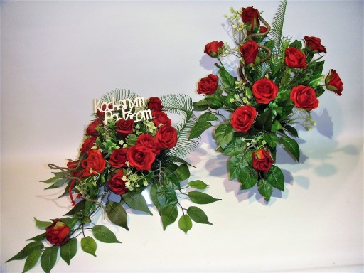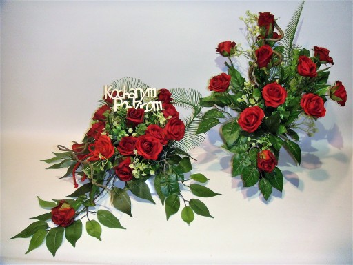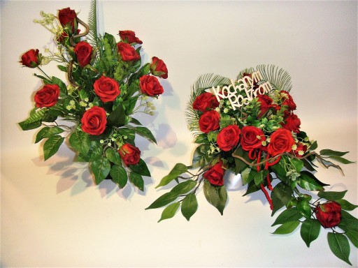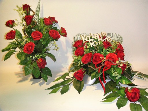 Do kompozycji użyto bardzo dobrej jakości sztucznych kwiatów oraz innych dodatków florystycznych jak pokazane na zdjęciach. Użyte materiały są odporne na warunki atmosferyczne, kompozycja z każdej strony prezentuje się bardzo ładnie.