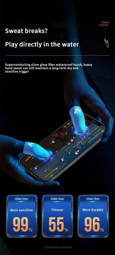 Play mobile games with these sweat-proof finger guards with touch that make it much more comfortable and smooth when you have to make your decisions during critical situations in games.The finger guard is sweat-resistant and made of durable fabric that allows you to touch the screen much faster than the finger itself thanks to the material the finger sleeve is made of.Light and breathable, gives a good touch. Highly elastic two-way interface, memory recovery, fits your fingertips tightly. Seamless sewing with high precision, non-slip setting, will not fall off. The touch screen gloves are small and light, easy to carry or store.Specifications: Material: Nano superconducting fiber Color: blue Process: 24 needles knitting Thickness: ?0.25mm Features: ultra-thin, sweat-proof, non-disconnected contact, good conductivity, elasticityChoose between 1 or 2 pairs
