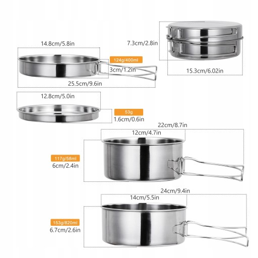 - Kompaktowy i sztaplowany zestaw do gotowania ze stali nierdzewnej, dzięki składanym uchwytom i kompatybilnym rozmiarom, garnki i patelnie można ustawiać jeden na drugim, aby zaoszczędzić miejsce.