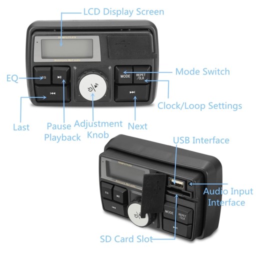 Audio motocyklowe Radio MP3 nagłośnienie głośniki Stereo Bluetooth wodoodporne funkcje FM 5 EQ wyświetlacz LCD USB/SD/TF Audio motocyklowe Radio MP3 nagłośnienie głośniki Stereo Bluetooth wodoodporne funkcje FM 5 EQ wyświetlacz LCD USB/SD/TF Anti-theft, wodoodporny. Monitor LCD. Wbudowany mikrofon. Identyfikator dzwoniącego. Przypomnienie dzwonka telefonu. Dostosować do dowolnego motocykla lub roweru elektrycznegoRadio odbierające pasmo FM, AM nie jest dostępne. Nie przegap wydarzeń sportowych ani specjalnych przypomnień podczas podróżyZestaw głośnomówiący Bluetooth i połączenie Bluetooth do słuchania muzyki, obsługuje USB / SD / TF, plug and playDzięki wytrzymałej wodoodpornej powłoce i wytrzymałym mocowaniom powłoka zapewni więcej opcji dla twojego motocykla, podczas gdy radio zbierze pasmo FM, a kierownica zapięcia sprawi, że będzie praktyczna i łatwa w użyciuJeśli nie chcesz przegapić powtórzeń wydarzeń sportowych, specjalnych wiadomości flash lub po prostu chcesz podłączyć telefon głośnomówiący Bluetooth, możesz słuchać muzyki przez połączenie Bluetooth podczas jazdy motocyklem, a następnie radio i jego obudowa są specjalnie zaprojektowane do motocykli. Akcesoria, które chceszNapięcie: DC 12VCzułość: 11dBStopień zniekształcenia: 0.5%Stosunek sygnału do szumu: 60dBZasilania/głośności przyciski5 funkcji EQ w trybie MP34 tryby: radio, wejście AUX, USB, SDKolor: czarnyMateriał: tworzywo sztuczneZawartość opakowania:1 * Radio1 * pilot zdalnego sterowania1 * kabel audio z akcesoriami instalacyjnymiTylko powyższa zawartość opakowania, inne produkty nie są uwzględnione.Uwaga: fotografowanie światłem i różne wyświetlacze mogą spowodować, że kolor przedmiotu na zdjęciu będzie trochę inny niż rzeczywisty. Błąd pomiaru wynosi +/- 1-3cm.