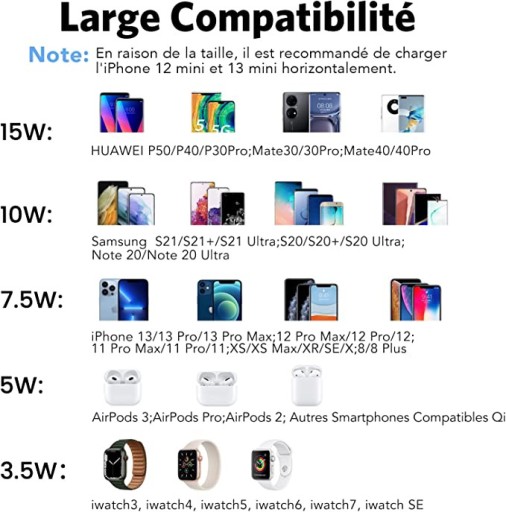 Szybkie ładowanie 15 W i uniwersalna kompatybilność: 7,5 W dla iPhone 13/13 Pro/13 Pro Max/12/12 Pro/12 Pro Max/11/11 Pro/11 Pro Max/XS/XS Max/XR/SE/X/8/8 Plus; 10 W dla Samsung S22/S21/S21+/S21 Ultra/S2011Ultr/S20+/S20 Ultra/Note 20/Note 20 Ultra; 5 W do AirPods 3/AirPods Pro/AirPods 2 i innych smartfonów z obsługą Qi; 3,5 W dla iwatch3, iwatch4, iwatch5, iwatch6, iwatch7, iwatch SE; 15 W dla Huawei P50/P40/P30Pro/Mate30/30/30 555555540/40 Pro. Uwaga: obsługuje tylko Apple Watch, nie działa z zegarkiem Samsung Watch / Huawei Watch.