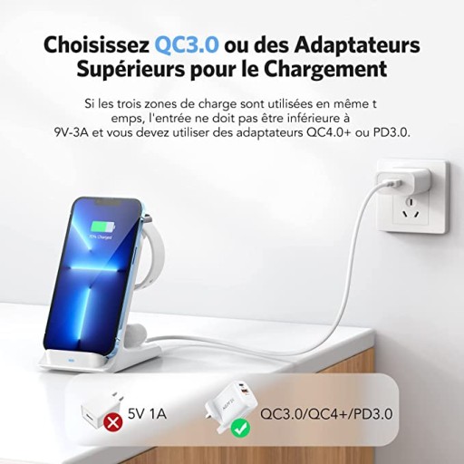 Bezprzewodowa stacja ładująca 3 w 1: Bezprzewodowa ładowarka AGPTEK 3 w 1 może jednocześnie obsługiwać smartfony, słuchawki douszne TWS z obsługą Qi i iWatch. Wbudowany moduł ładowania zegarka, który umożliwia natychmiastowe ładowanie bez konieczności instalowania ładowarki zegarka. Uwaga: Podczas ładowania 3 urządzeń jednocześnie, wymagany jest adapter QC3.0/QC4.0+/PD3.0 (brak w zestawie), NIE używaj adaptera 5V/1A ani portu USB komputera jako zasilacza, nie powoduje niewystarczającego zasilania.