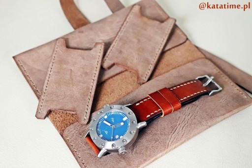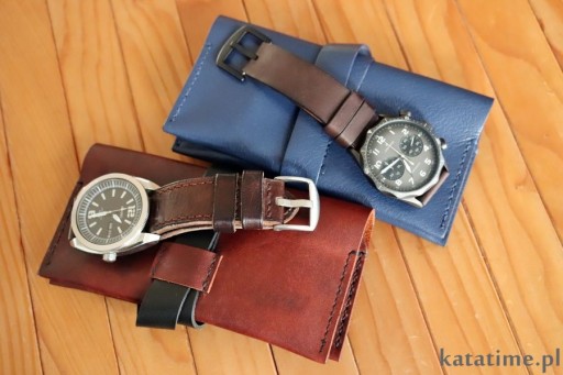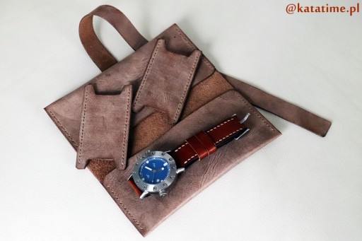 Wykonane jest z naturalnej skóry przez naszych kaletników. Skóra jest miękka ale dość gruba (żeby dobrze zabezpieczała zegarki), w kolorze brązowym z ciekawą, cieniowaną fakturą i szyciem w kolorze skóry.