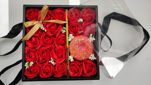 Torebka box z pachnącymi różami z mydła nadającymi się do kąpieli. Róże ładnie pachną i ślicznie wyglądają....Nie więdną jak prawdziwe kwiaty. Długo będą cieszyć oczy osoby obdarowanej...