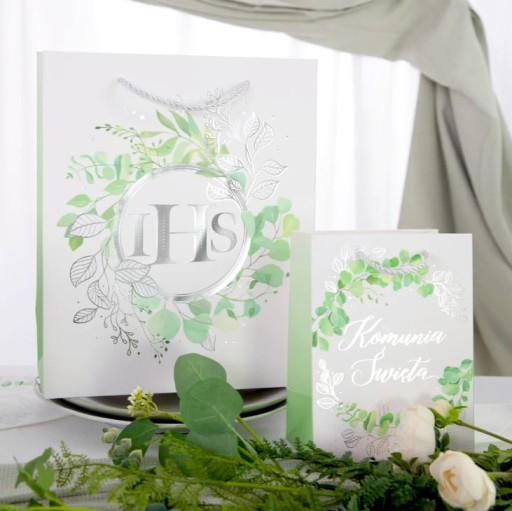 Złamany odcień bieli z przodu i tyłu torebki na prezenty, z bardzo ciekawą grafiką oraz delikatna, cieniowana zieleń boków sprawią, że będzie to wspaniałe opakowanie dla podarunków z okazji Pierwszej Komunii Świętej. Motyw przedstawia srebrną hostię otoczoną wianuszkiem zielonych i srebrnych listków eukaliptusa.