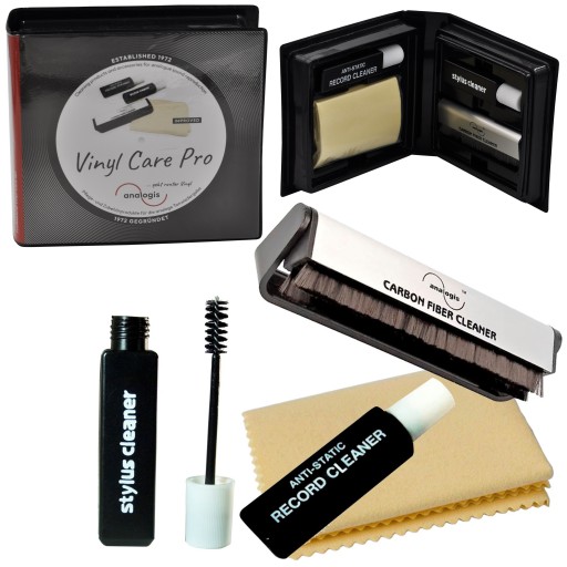 Zestaw do pielęgnacji Analogis, składa się z wygodnej szczoteczki do płyt z karbonowymi włóknami, antystatycznej ściereczki z mikrofibry, 20ml płynu do czyszczenia igieł ze szczoteczką, oraz 20ml płynu do czyszczenia płyt.