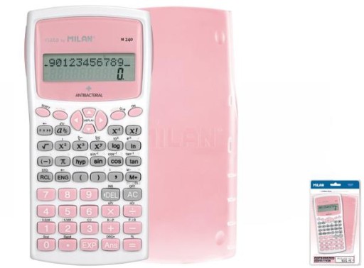 Kalkulator naukowy ze specjalną obudową, która wraz z klawiszami i ochronną pokrywką zawiera biocyd i poddana jest działaniu szkła fosforanowo-srebrowego (CAS 308069-39-8) o działaniu przeciwbakteryjnym. Idealny do poprawy higieny w szkole, w biurze, w środowiskach mających kontakt z żywnością i środowiskach sanitarnych. Posiada 240 zintegrowanych funkcji. 2 liniowy wyświetlacz LCD (10 + 2 cyfry). Równoczesne wyświetlanie wyrażenia matematycznego i wyniku. Biało-różowy kalkulator z wytrzymałym przezroczystym pokryciem ochronnym. Zasilanie: 2 x baterie AAA w zestawie. Zawiera instrukcje. Kalkulatory MILAN spełniają wymagania dyrektywy RoHS o ograniczeniach stosowania niektórych substancji niebezpiecznych w urządzenia elektrycznych i elektronicznych. Oryginalny projekt stworzony przez własny dział badawczo-rozwojowy MILAN. Pakowany na blistrze. Rozmiar kalkulatora: 16,7 x 8,4 x 1,9 cm. Najważniejsze dostępne funkcje: obliczenia statystyczne; rachunek 6 różnych rodzajów regresji wraz z ich współczynnikami A,B; wzajemna transformacja współrzędnych prostokątnych i biegunowych; bezpośrednie operacje na ułamkach, także sześćdziesiątkowych; funkcje trygonometryczne i odwrotne do trygonometrycznych; funkcje paraboliczne i hiperboliczne oraz im odwrotne; obliczenia z zastosowaniem jednostek kątowych w stopniach, radianach, gradach; konwersja między systemem dziesiętnym i sześćdziesiętnym; generowanie wartości losowych; obliczanie kombinacji i permutacji; notacja inżynierska; kursor do zmiany MENU; statystyka dwuwymiarowa z obliczaniem wartości średniej, szacowanej i sum; funkcje SCI/FIX/ENG.
