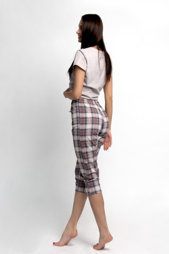 Bawełniana piżama damska z kolekcji Mustique z krótkim rękawem i 3/4 spodniami. Spodenki we wzorze oryginalnej kraty, zwężane w pasie gumą, w komplecie z koszulką w kolorze beżowym z uroczym nadrukiem, pięknie się razem komponują. Ta piżamka to propozycja w sam raz na nadchodzące ciepłe dni.