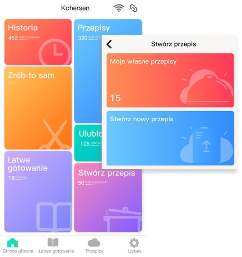 Wielofunkcyjny robot kuchenny Kohersen CY021 został wyposażony w bazę niemal 500 przepisów w języku polskim: 150 wbudowanych w samym urządzeniu, a do kolejnych 350 masz stały, bezpłatny dostęp w chmurze, z którą łączysz się za pomocą WiFi. Baza jest ciągle poszerzana o kolejne receptury, które tworzymy wespół z gospodyniami domowymi i technologiem żywności.