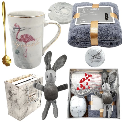 Spraw piękny prezent bliskiej osobie , nasz zestaw to idealny prezent dla NIEJ piękny kubek z złotym zdobieniem oraz namalowanym flamingiem wszystko ręcznie wykonane, aksamitna maskotka w kształcie króliczka miłego w dotyku, ręcznik bardzo delikatny i miękki , pudełeczko na drobiazgi, wszystko pięknie zapakowane w twardy karton z złotym zdobieniem oraz dodatkowo papierowa torebka.