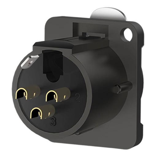 3-pinowe gniazdo panelowe XLR żeńskie wykonane z materiałów o dużej wytrzymałości. Konstrukcja z powłoką ze stopu cynku została pokryta dodatkowo czarną, elektroforetyczną warstwą lakierniczą. Jego ergonomiczny kształt gwarantuje bezpieczeństwo, trwałość i niezawodność.