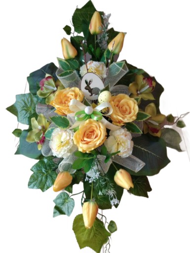 Kompozycja sztuczna (tzw. stroik, ikebana) jest wykonana z sztucznej choiny w doniczce plastikowej co daje jej stabilność.