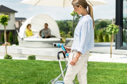 Konstrukcja wózka umożliwia wygodne przewożenie i przechowywanie długich odcinków węża