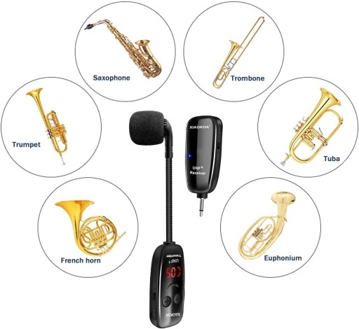 Mikrofon radiowy UHF najnowsza technologia radiowa UHF stabilny sygna bez opónień. Zasig transmisji w otwartym polu moe osign 50 metrów. Antyinterferencja moe by uywana jednoczenie kilka grup mikrofonów bez zakócania sobie nawzajem. Cyfrowy wywietlacz LED bezprzewodowy mikrofon do instrumentów z wywietlaczem cyfrowym LED do atwego wywietlania czstotliwoci poziomu baterii gonoci. Klips obracany o 360 stopni mona atwo przymocowa do sprztu instrumentów muzycznych a odporny na uderzenia klips silikonowy moe skutecznie odfiltrowa dwiki wytwarzane przez wibracje wyposaenia instrumentów muzycznych. Bardzo czuy przetwornik dwiku wbudowany mikrofon pojemnociowy o wysokiej czuoci idealnie rejestruje ciek dwikow instrumentu i sprawia e dwik jest wyraniejszy i bardziej realistyczny. Szerokie spektrum zastosowań bezprzewodowe mikrofony s kompatybilne ze wzmacniaczami systemami gonikowymi itd. Nadaje si na koncerty wystpy zespoowe indywidualne wiczenia próbki zespou. Nadaje si do trbki tuby rógu puzonu saksofonu klarnetu i innych dmuchaczy blachy. Szybkie adowanie przez USB wbudowany akumulator 400 mAh 56 godzin czasu pracy po 2 godzinach adowania. Czerwone wiato wieci podczas adowania a czerwone wiato jest wyczone gdy jest w peni naadowane.