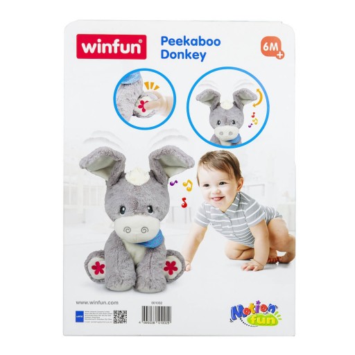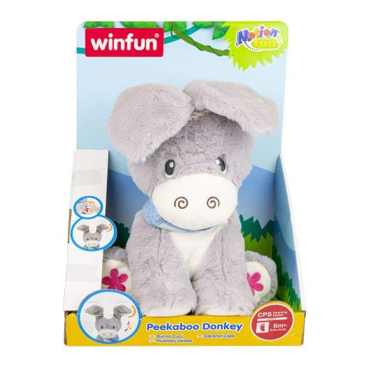 Osiołek posiada w łapkach przyciski, które uruchamiają zabawę w A ku ku, wypowiada zdania i śpiewa piosenki. Maskotka posiada opadające uszka.