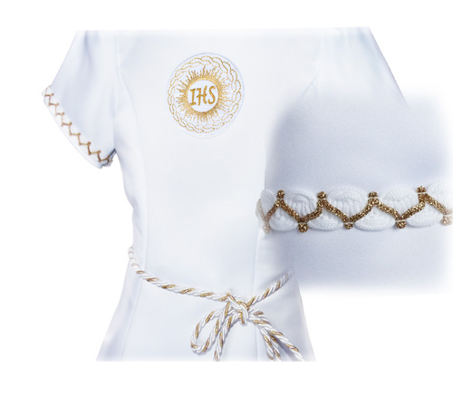 - Zdobienia - W pasie przewiązana złoto białym sznurem . Na rękawkach oraz na dole lamowana białą lamówką ze złotym lureksem. Na karczku hostia (lub bez)/ W standardzie złota.
