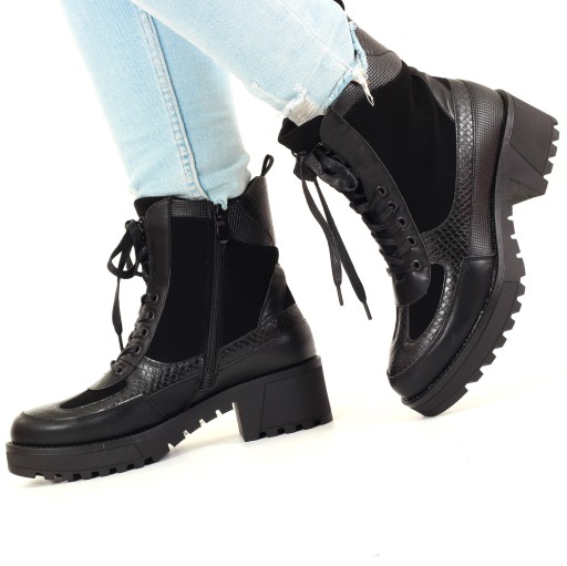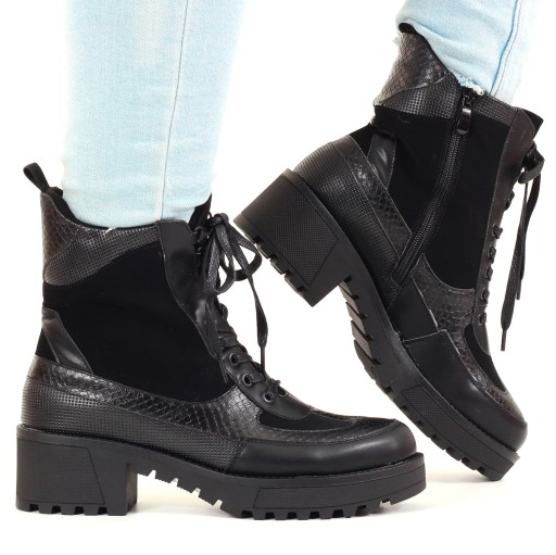 HIT! Damskie botki na traperowej podeszwie w kolorze czarnym. Zapinane na suwak oraz wyposażone w sznurówki. Najnowszy wzór i trendy!!!!